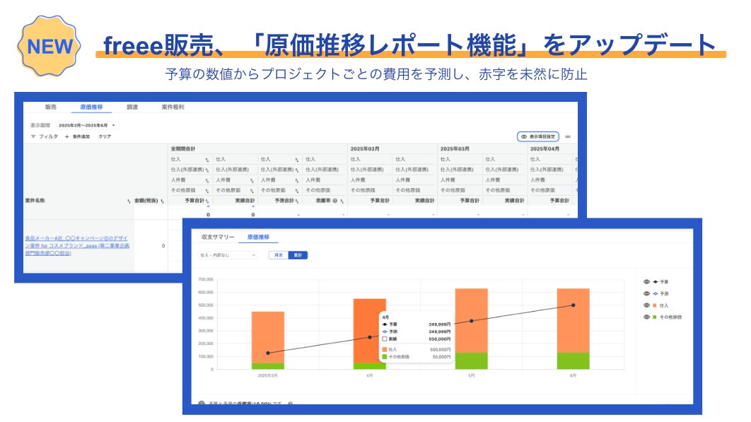 freee販売、「原価推移レポート」をアップデート 予算の数値からプロジェクトごとの費用を予測し、赤字を未然に防止