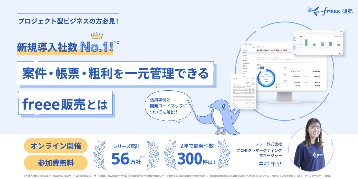 セミナータイトル:新規導入社数No1!案件管理・帳票管理・粗利管理を1つのシステムで完結するfreee販売とは〜活用事例と開発ロードマップについても解説!〜