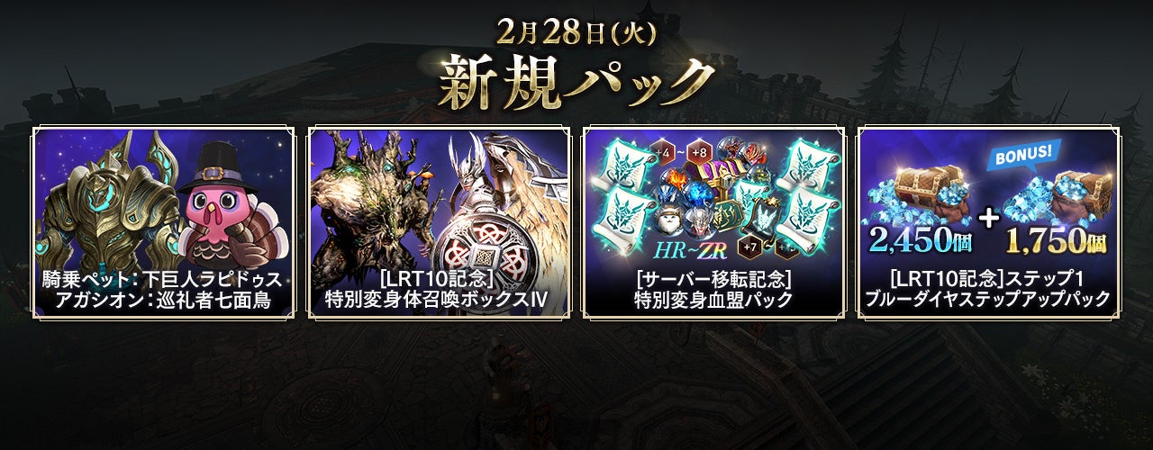 さらにサーバー移転記念として「特別変身体召喚ボックスⅣ」が含まれた「[サーバー移転記念]特別変身血盟パック」や、「+15強化変身体強化スクロール」が獲得できる「[LRT10記念]特別変身体召喚ボックスⅣ10+1」なども登場しております。ぜひご確認ください。