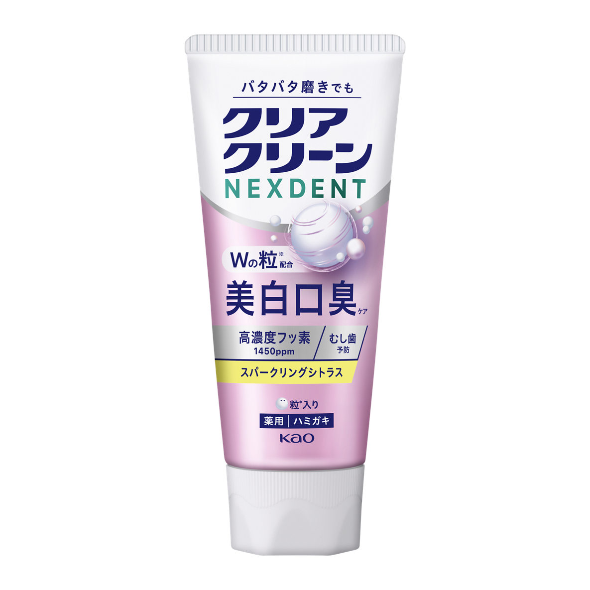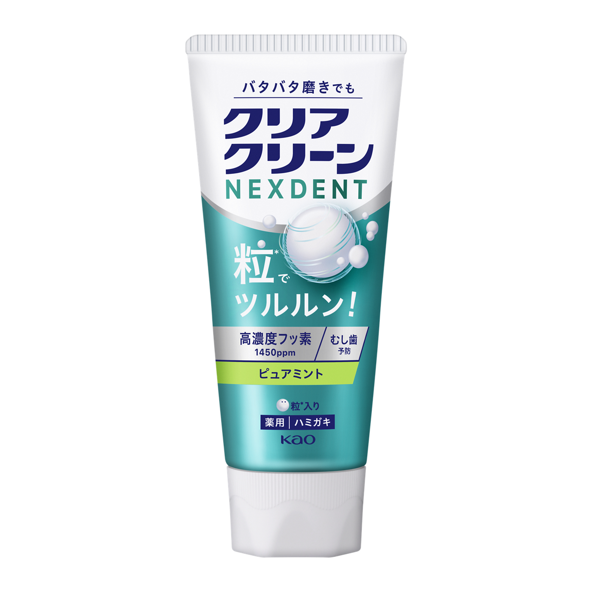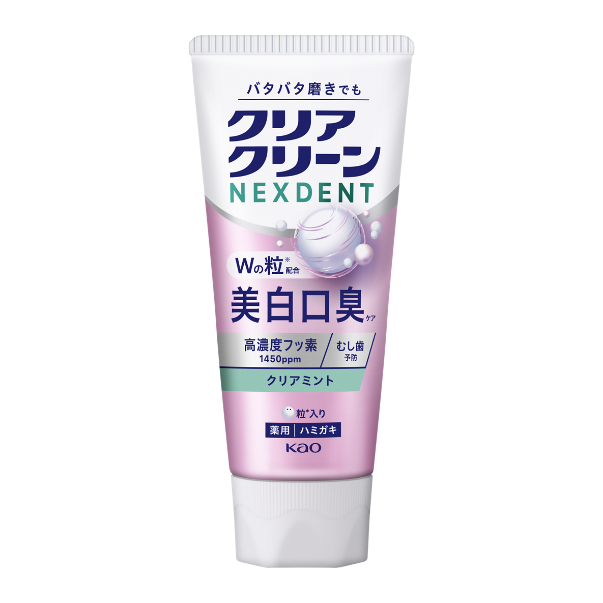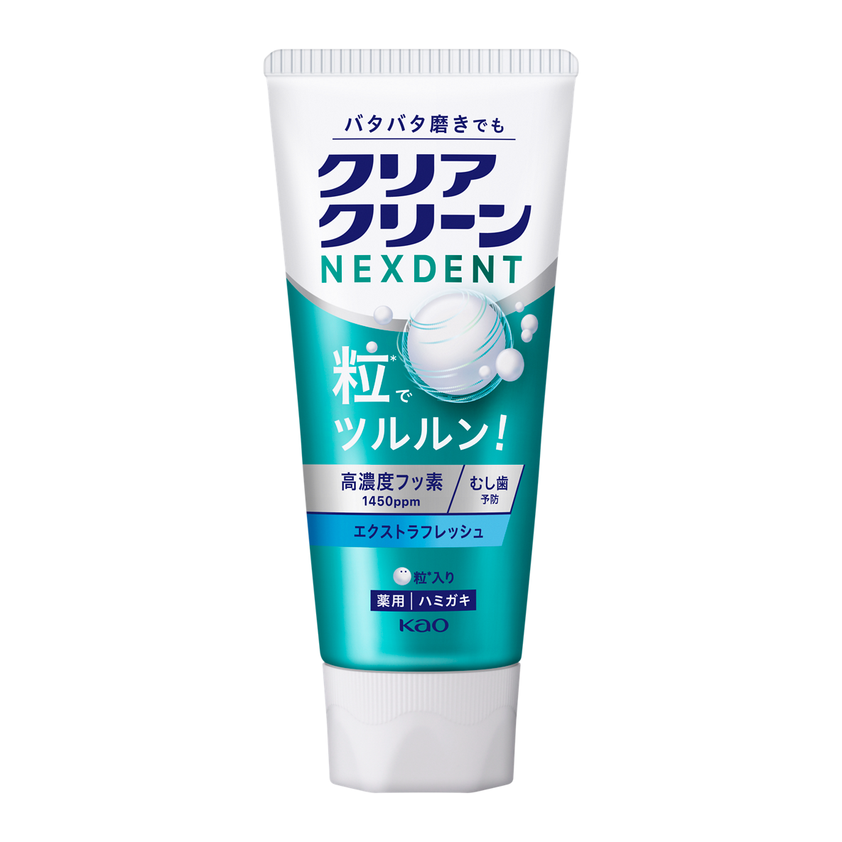 そこで、毎日忙しく“バタバタ磨き”になってしまう方に向けて、ハブラシが届きにくい歯のすき間まで粒*1 が砕けながら届き、歯垢を除去する、新しい「クリアクリーンNEXDENT」を発売します。今回の改良では、粒*1の配合量を約1.5倍*2 に増量。忙しい中でも、効率的な歯磨き習慣を可能にしました。さらに、高濃度フッ素1450ppm。すすいでも残るフッ素処方で、磨くたびむし歯リスクから守ります。