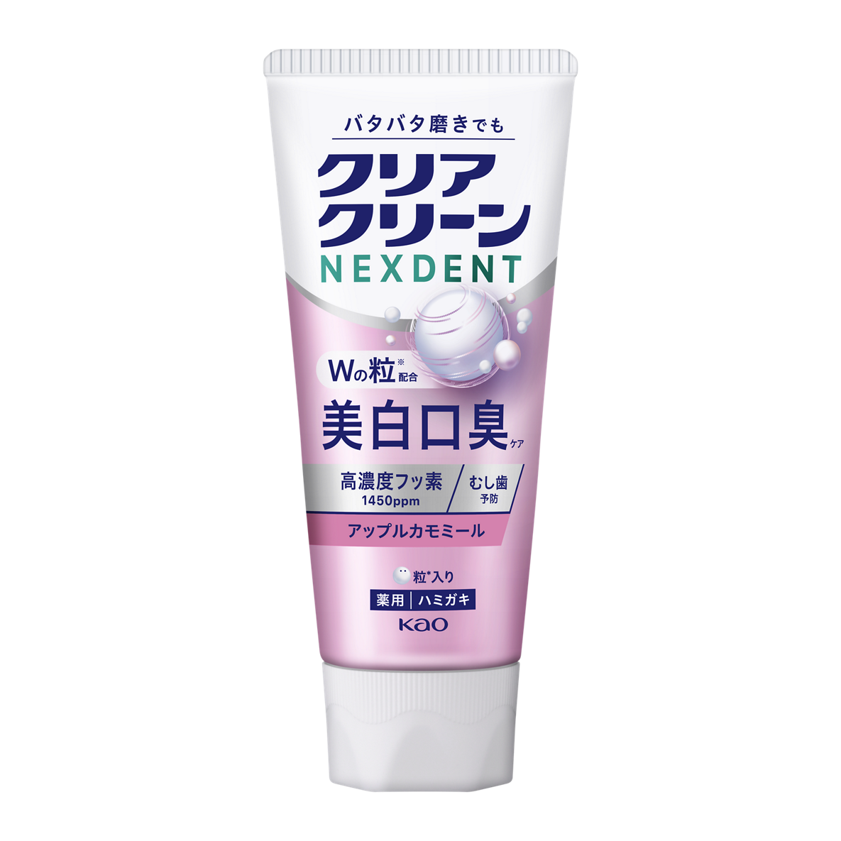 レギュラータイプに加え、美白口臭ケアもできる「クリアクリーンNEXDENT 美白口臭ケア」【医薬部外品】も同時発売します。3種の香味(アップルカモミール、クリアミント、スパークリングシトラス)で展開します。