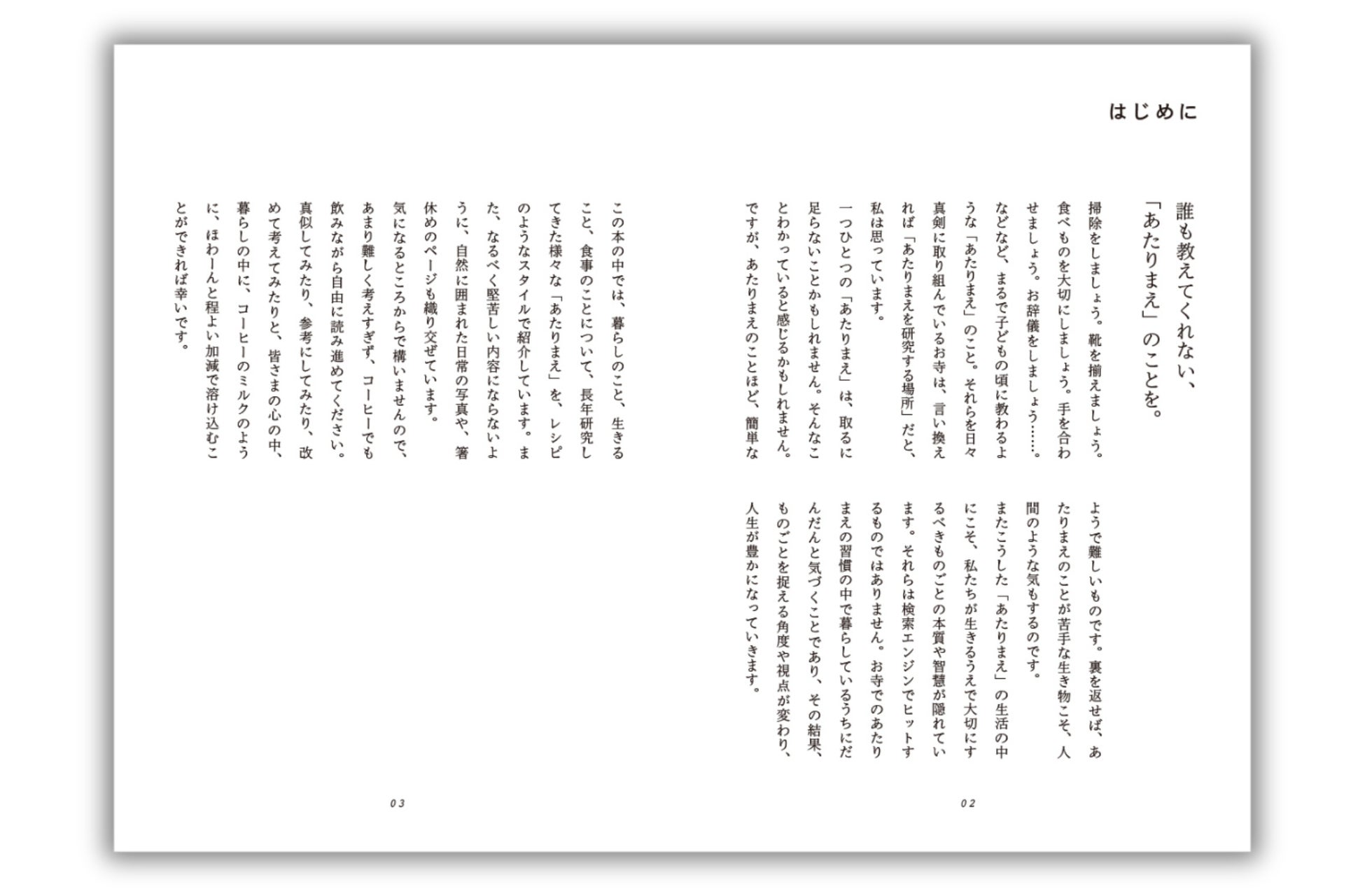 掃除をしましょう。靴を揃えましょう。食べものを大切にしましょう。手を合わせましょう。お辞儀をしましょう……。などなど、まるで子どもの頃に教わるような「あたりまえ」のこと。それらを日々真剣に取り組んでいるお寺は、言い換えれば「あたりまえを研究する場所」だと、私は思っています。(中略)この本の中では、暮らしのこと、生きること、食事のことについて、長年研究してきた様々な「あたりまえ」を、レシピのようなスタイルで紹介しています。(本書「はじめに」より)