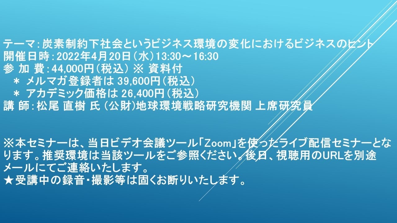 先端技術情報や市場情報を提供している(株)シーエムシー・リサーチ(千代田区神田錦町: https://cmcre.com/ )では、 各種材料・化学品などの市場動向・技術動向のセミナーや書籍発行を行っておりますが、 このたび「炭素制約下社会というビジネス環境の変化におけるビジネスのヒント」と題するセミナーを、 講師に松尾 直樹 氏 (公財)地球環境戦略研究機関 上席研究員)をお迎えし、2022年4月20日(水)13:30より、 ZOOMを利用したライブ配信で開催いたします。 受講料は、 一般:44,000円(税込)、 弊社メルマガ会員:39,600円(税込)、 アカデミック価格は26,400円(税込)となっております(資料付)。