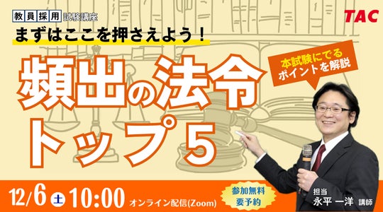 【TAC教員採用試験】頻出の法令を押さえれば教育法規なんて余裕!「頻出の法令トップ5」を12/6(土)配信!