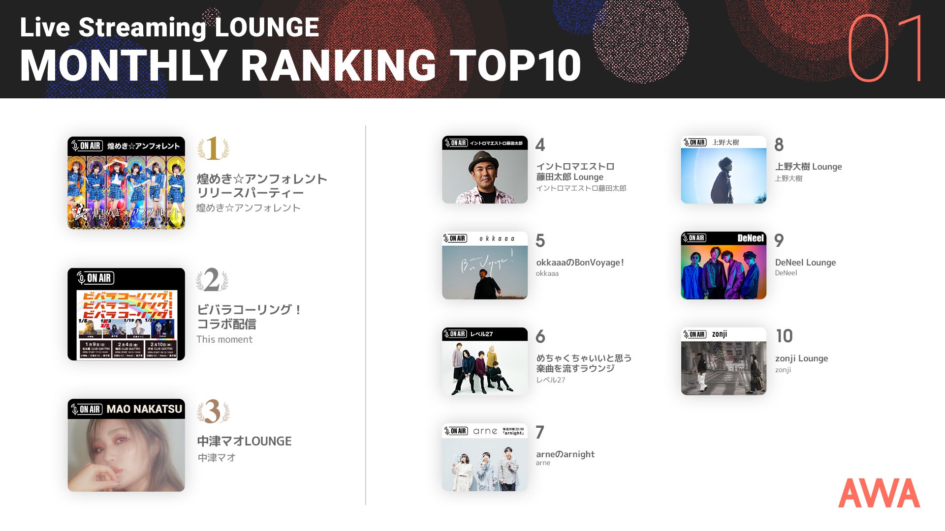 AWA株式会社(本社:東京都港区、代表取締役CEO:冨樫晃己)が運営する、サブスクリプション型(定額制)音楽ストリーミングサービス「AWA(アワ)」は、昨年12月に音声ライブ配信機能とギフティング機能「応援メッセージ」の正式提供を開始。すでに、40組以上のアーティストによって、音声ライブ配信を利用した「ラジオ配信ラウンジ」が開催されています。今回、2022年1月1日(日)から1月31日(月)までに開催された、ラジオ配信ラウンジの視聴数、開催頻度、リアクション数などを総合して、人気ランキングTOP10を発表いたしました。