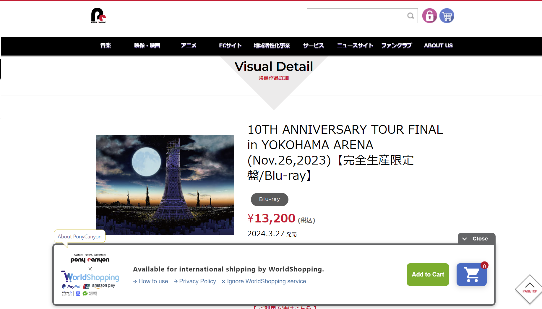 海外からポニーキャニオン公式サイトにアクセスすると、自動的に「WorldShoppingカート」がポップアップで表示されます。「Add to Cart」をクリックすると商品の購入に進みます。