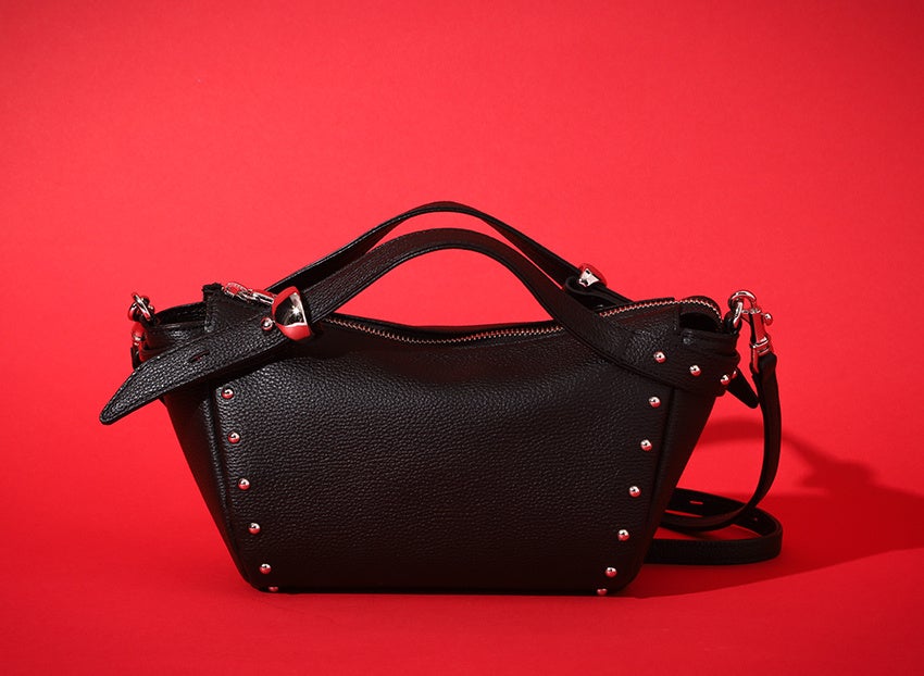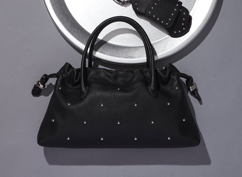 レザーの柔らかさを活かした巾着型ハンドバッグ「シュシュ(S)」に、スタッズの煌めきを。光を受けてやわらかに反射するスタッズが、クラシックなフォルムをモードに引き上げます。しなやかなソフトシュリンクレザーと、手元で揺れる金具のコントラストが、さりげないのに印象的な佇まい。デイリーにもドレスアップにも映える、上品な存在感です。