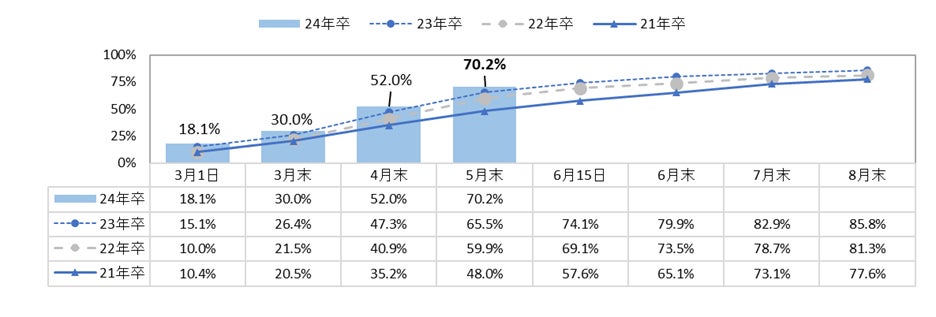 2024年卒業予定の大学生・大学院生の内々定率は70.2%で、前年比4.7pt増加【図1、2】