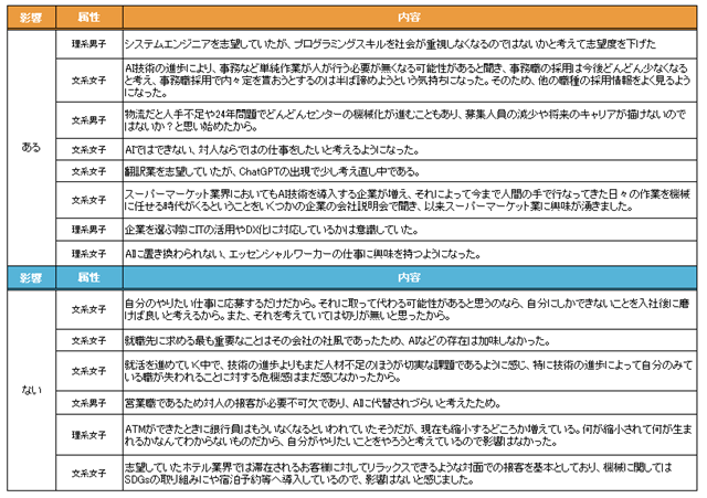 AI技術などの登場が、就職観や志望先に影響した学生は15.3%。「AIではできない、対人ならではの仕事をしたい」や「企業を選ぶ際にITの活用やDX化に対応しているか意識した」などの意見も【図3、4】