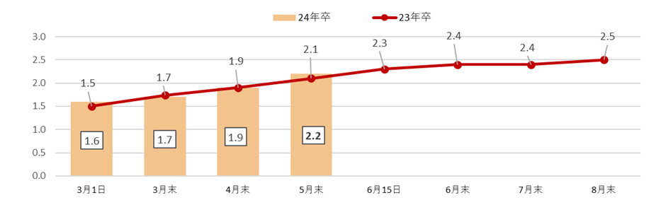2024年卒業予定の大学生・大学院生の5月末時点での内々定率は前年比4.7pt増の70.2%で、平均内々定保有社数は前年比0.1社増の2.2社だった。4月同様、内々定率・平均内々定保有社数ともに高い水準で推移している。【図1、2】