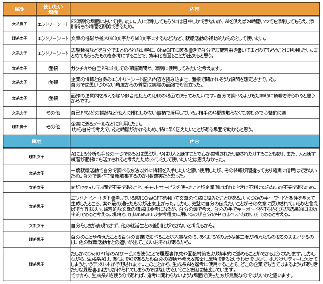 就職活動における生成系AIによるチャットサービスの利用については、実際に利用したことがある学生は18.4%で、利用したいと考えている学生が3割程度となりましたが、「使いたいと思わない」あるいは「わからない」という学生も同程度おり、学生の中でも意見が分かれているようです。学生の利用用途の中には、不正確な情報が含まれている可能性や個人情報漏洩の可能性などの注意が必要なものもありましたが、AIの得意・不得意を理解しあくまで補助的な用途で活用したい人が多いこともわかりました。利用に際してはAIの特性を理解しツールとしてうまく活用するためのリテラシーが重要だと考えられます。