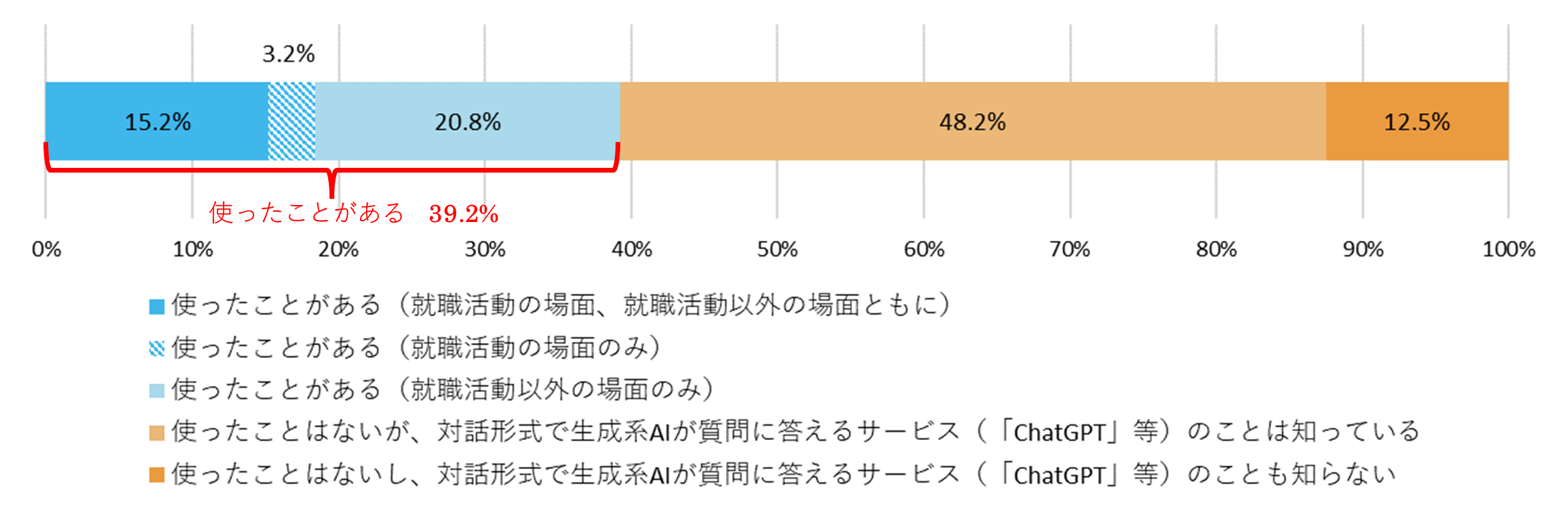 「ChatGPT」などの生成系AIによるチャットサービスの利用経験で、最も多かったのは「使ったことはないがサービスのことは知っている」で48.2%、利用経験がある学生は39.2%で、就職活動で使ったことがある学生は18.4%だった。一部の学生の間ではAIチャットサービスの利用が広がっているようだ。【図5】