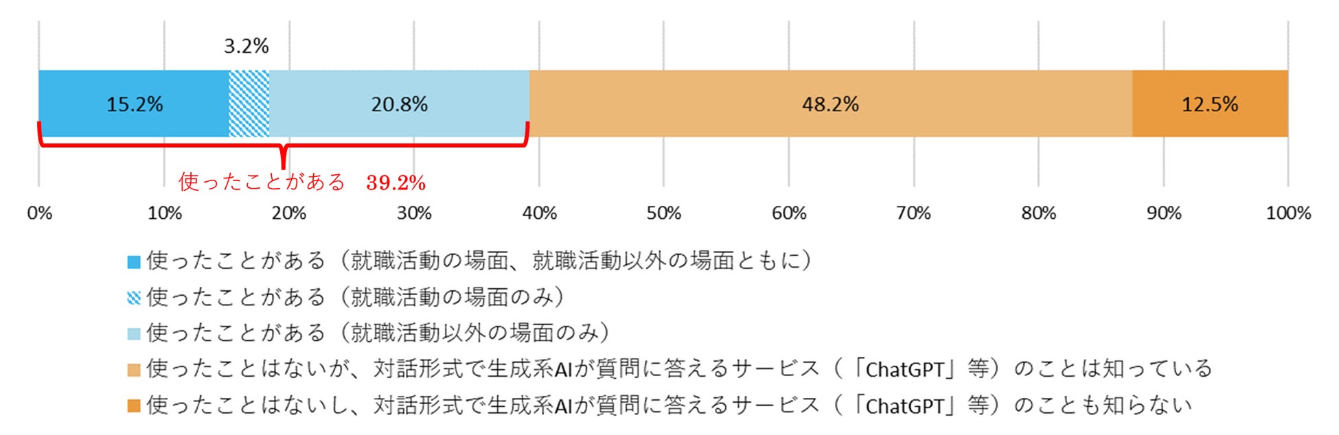 AI技術など新しいテクノロジーが、就職観や志望先選択に影響した学生は15.3%。AIチャットサービス(ChatGPT等)の利用経験がある学生は約4割。就活での利用経験は18.4%