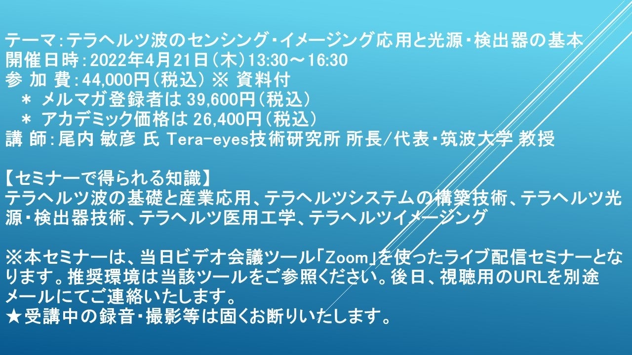 先端技術情報や市場情報を提供している(株)シーエムシー・リサーチ(千代田区神田錦町: https://cmcre.com/ )では、 各種材料・化学品などの市場動向・技術動向のセミナーや書籍発行を行っておりますが、 このたび「テラヘルツ波のセンシング・イメージング応用と光源・検出器の基本」と題するセミナーを、 講師に尾内 敏彦 氏 Tera-eyes技術研究所 所長/代表・筑波大学 教授)をお迎えし、2022年4月21日(木)13:30より、 ZOOMを利用したライブ配信で開催いたします。 受講料は、 一般:44,000円(税込)、 弊社メルマガ会員:39,600円(税込)、 アカデミック価格は26,400円(税込)となっております(資料付)。