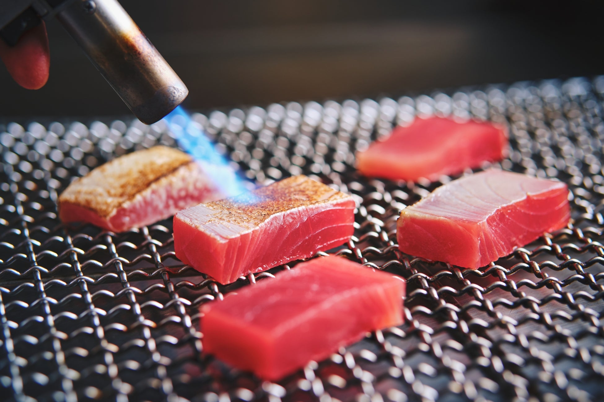 黒毛和牛のステーキ / まぐろの炙り / まぐろカツ / まぐろの押し寿し など