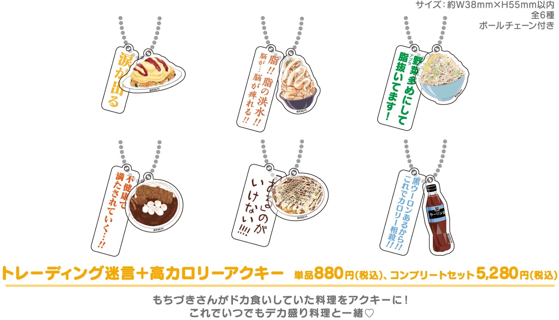 アクキー、ステッカー、タオルなどの定番商品から、「カロリー×1/2皿」など『ドカ食いダイスキ!もちづきさん』ならではのオリジナルグッズもモリモリご用意しております!