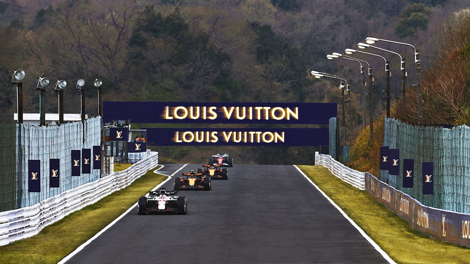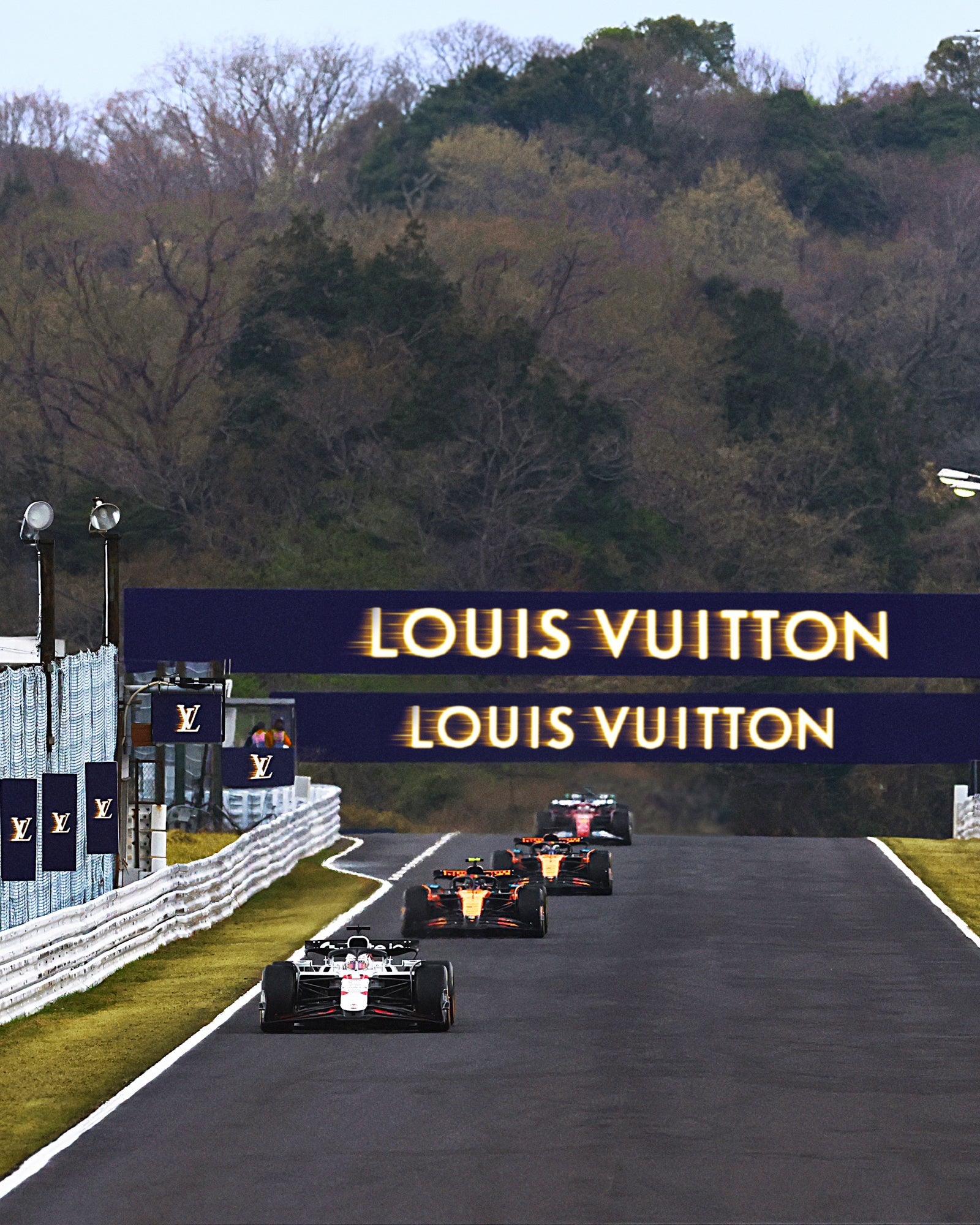ルイ·ヴィトンはトラック用のクリエイティブなサイネージも披露。特別にデザインされたルイ·ヴィトンのシグネチャーは、美しい自然に囲まれた鈴鹿サーキットでコース上のバリアなどに掲出されました。メゾンにとって大切な価値観の1つであるパフォーマンスをイメージした新しいデザインは、F1®カーの突き抜けるような疾走感に溢れています。