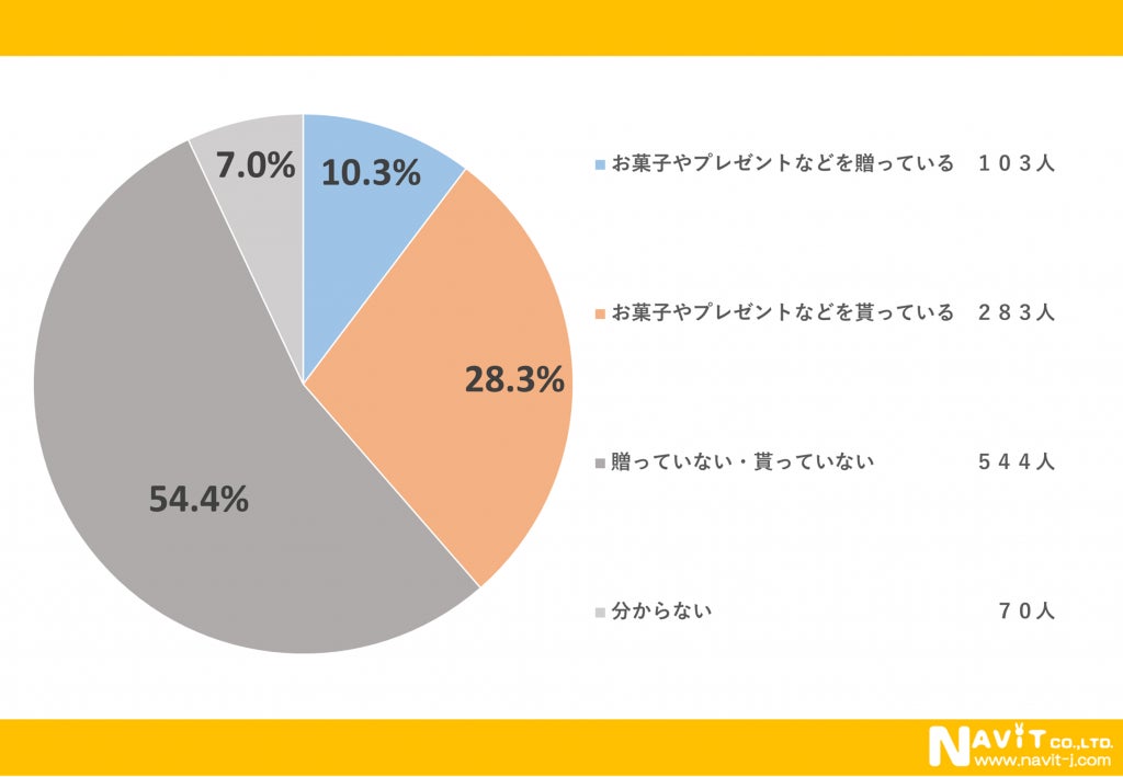 ホワイトデーに贈り物を贈ったり貰ったりしているかというアンケートでは「お菓子やプレゼントなどを貰っている」と回答された人が1番多く28.3%でした。次に多かったのは「お菓子やプレゼントを贈っている」と回答した人で10.3%という結果になりました。