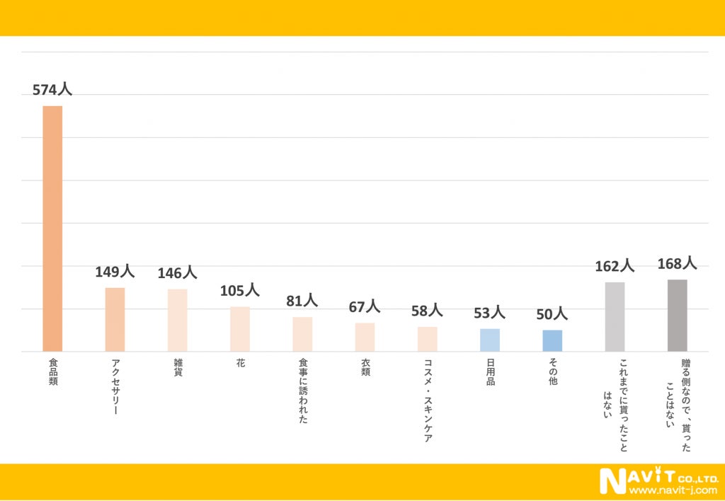 ホワイトデーに貰ったことがあるものに対するアンケートで1番多かったのは「食品類」で574人でした。次に多かったのが「アクセサリー」で149人、3番目に「雑貨」が146人と続いています。