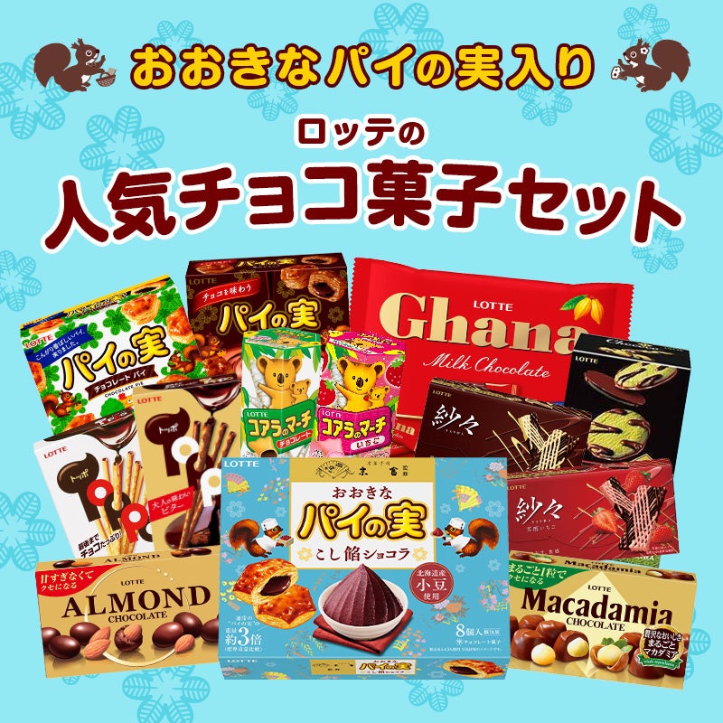 京菓子司末富監修 おおきなパイの実<こし餡ショコラ>と一緒に、『コアラのマーチ』、『トッポ』、『アーモンドチョコレート』などが入ったロッテの人気チョコ菓子13種13品のセットです。