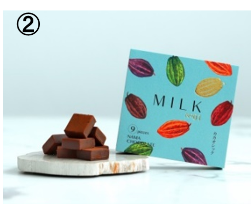 ②カカオの豊かな香りと、ミルクの甘みがバランス良い生チョコレート。ほどよい上品な甘さで、良質なミルクの風味が際立つ、シンプルでコク深い一粒です。