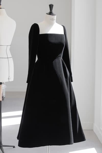 レディー・ガガは、オートクチュール コレクションからブラックのシルクベルベットドレスを纏い、帽子も合わせました。このドレスの製作には550時間をかけて完成に導かれています。