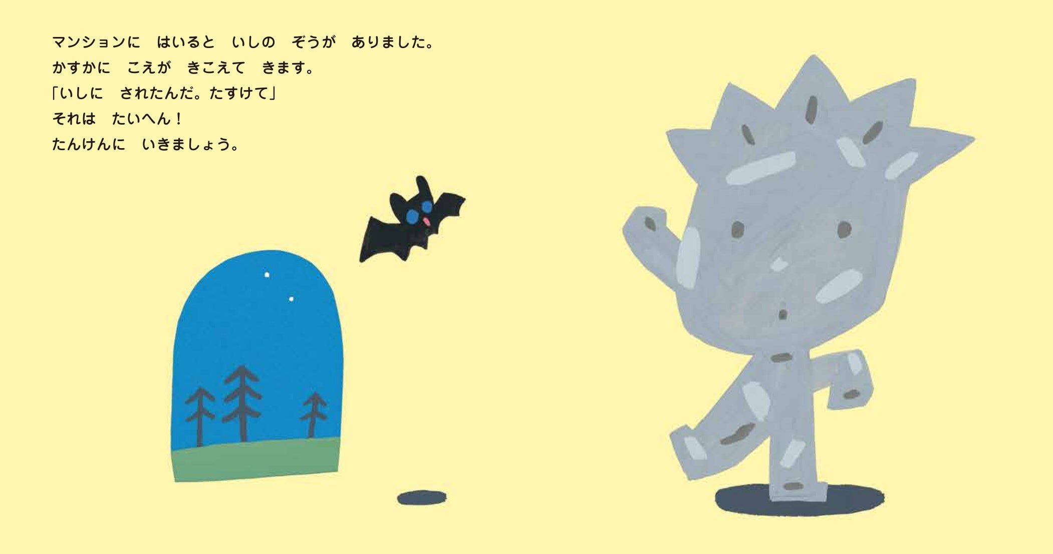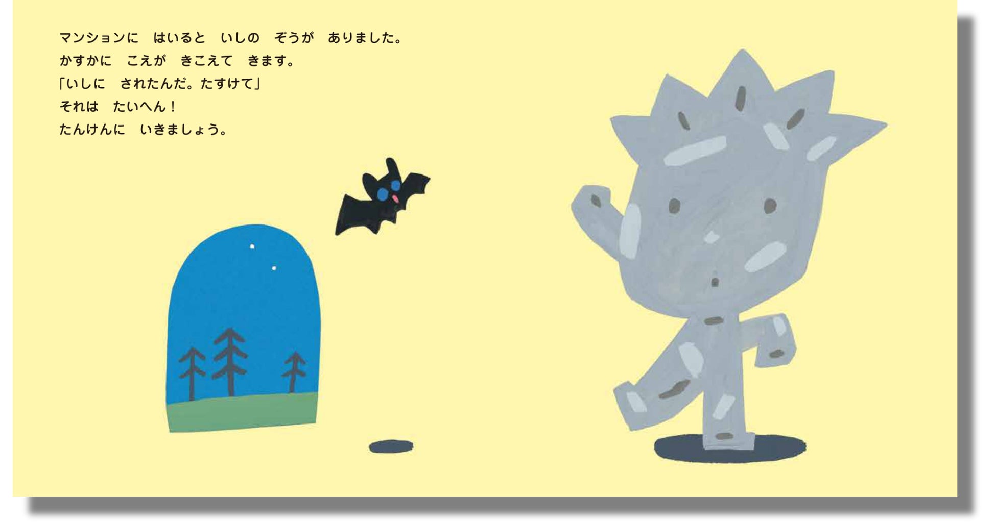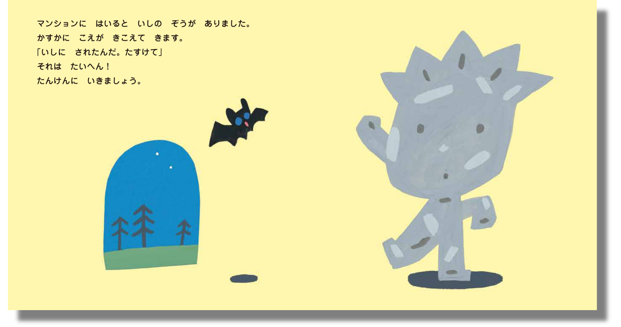 おばけマンションの入り口に謎の石の像が現れます。中からは「たすけて~~~~」という小さな声。ふわふわおばけ、ゾンビ、メデューサの部屋を訪ね石の像を元に戻す方法を探ります!ちょっぴり怖くて、でも、なんだか憎めないおばけたちが登場。無事に声の主を助けることはできるのでしょうか?
