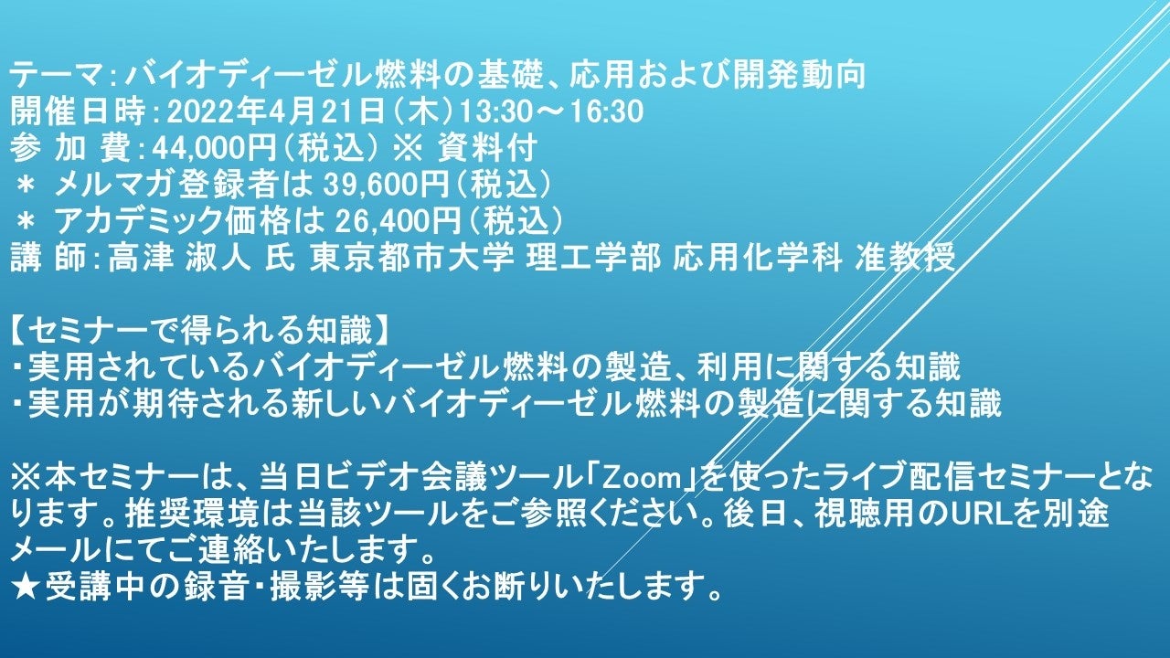 先端技術情報や市場情報を提供している(株)シーエムシー・リサーチ(千代田区神田錦町: https://cmcre.com/ )では、 各種材料・化学品などの市場動向・技術動向のセミナーや書籍発行を行っておりますが、 このたび「バイオディーゼル燃料の基礎、応用および開発動向」と題するセミナーを、 講師に高津 淑人 氏 東京都市大学 理工学部 応用化学科 准教授)をお迎えし、2022年4月21日(木)13:30より、 ZOOMを利用したライブ配信で開催いたします。 受講料は、 一般:44,000円(税込)、 弊社メルマガ会員:39,600円(税込)、 アカデミック価格は26,400円(税込)となっております(資料付)。