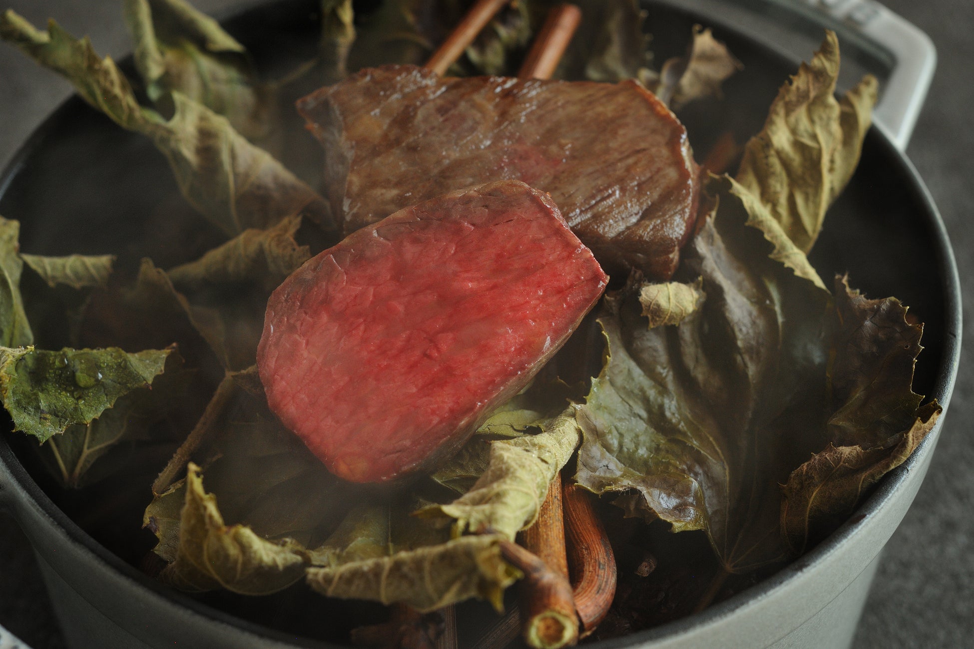 葡萄の搾り粕を食べて育った牛肉に、葡萄の枝や葉の薫香を纏わせ仕上げることで、より牛肉の旨味を引き立てたグリッリア(*6)です。ポルチーニのグラティナート(*7)と合わせた、この地域ならではのイタリア料理が存分に味わえます。