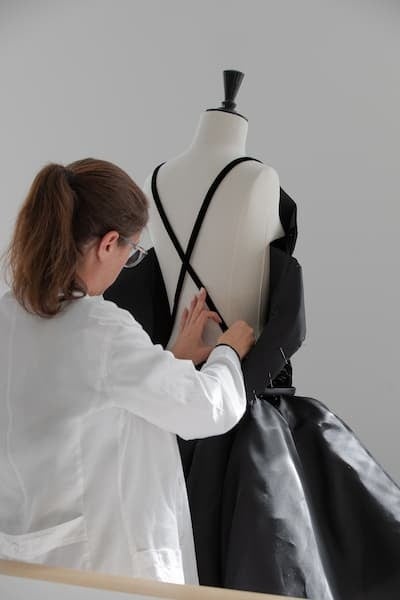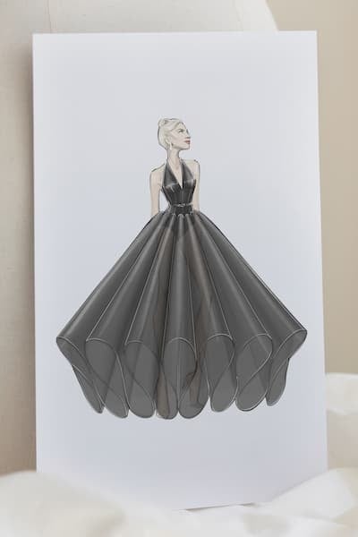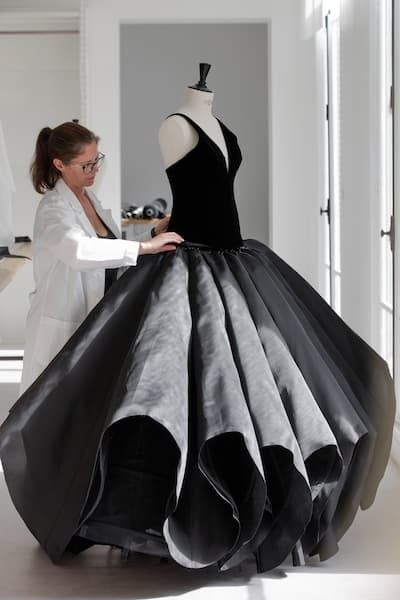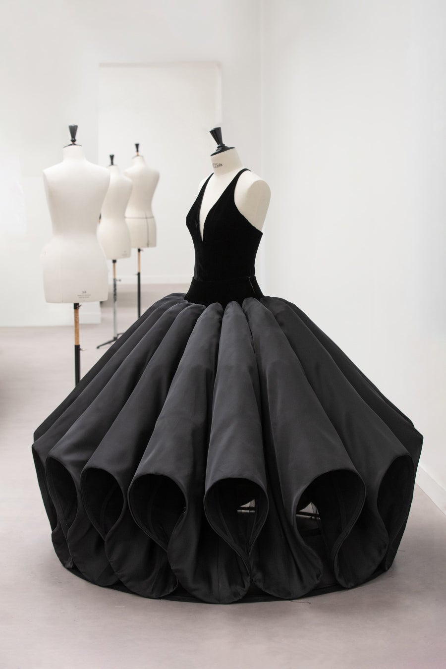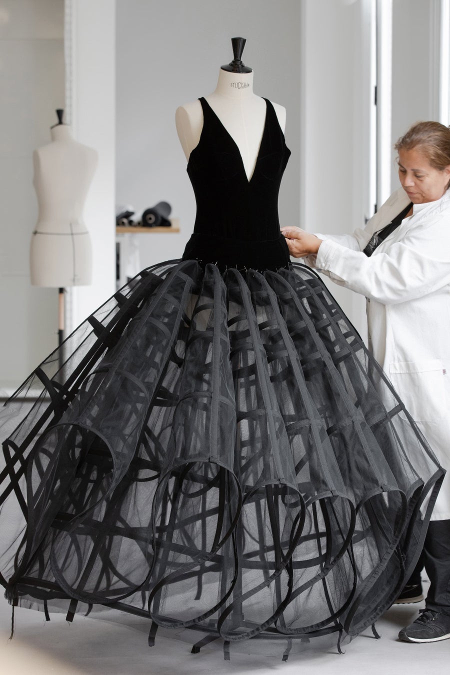 レディー・ガガは、オートクチュール コレクションからブラックベルベットのビスチェに、ブラックのシルクとベルベットのスカートを纏いました。このビスチェの製作には300時間、スカートには550時間が費やされ、完成に導かれています。