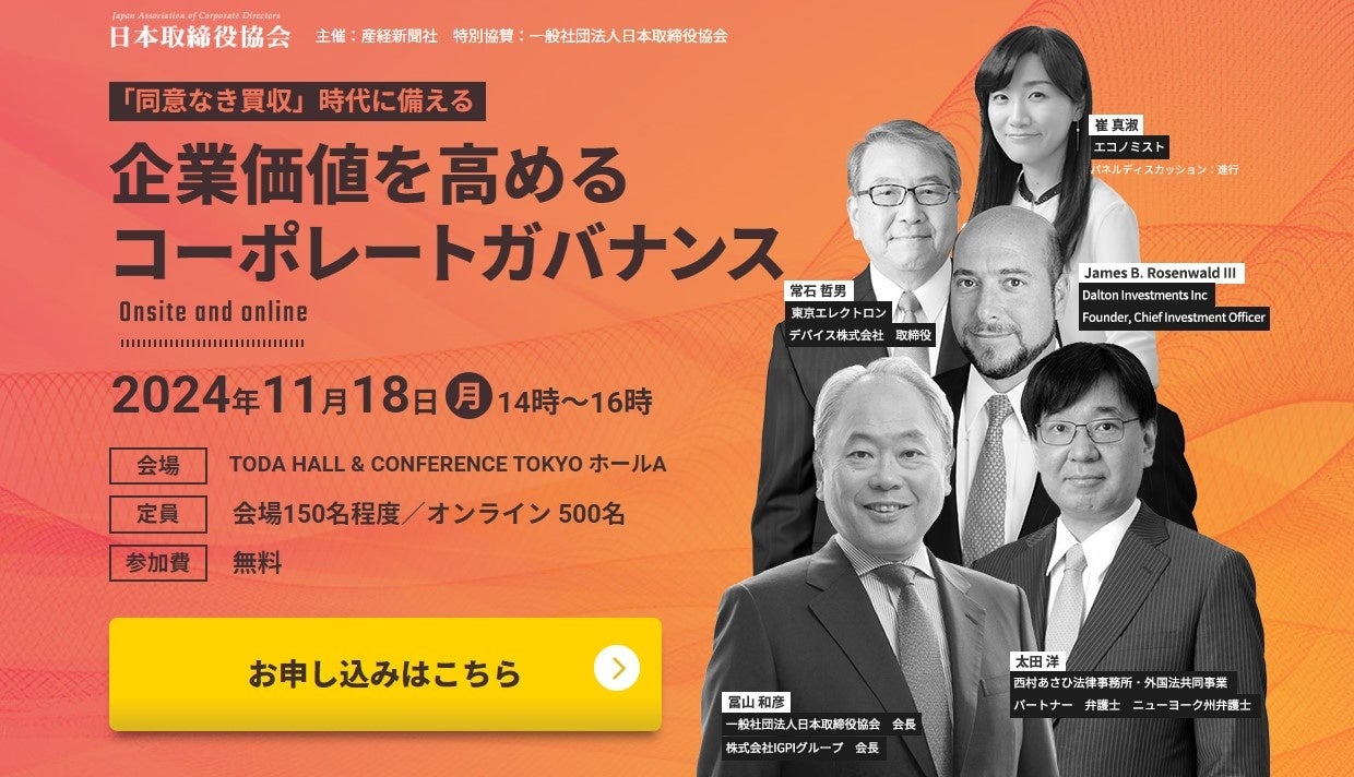 産経新聞社は、フォーラム「『同意なき買収』時代に備える 企業価値を高めるコーポレートガバナンス」をTODAホール&カンファレンス東京(東京都中央区)とオンラインで11月18日(月)午後2時から開催し、参加者を募集します。