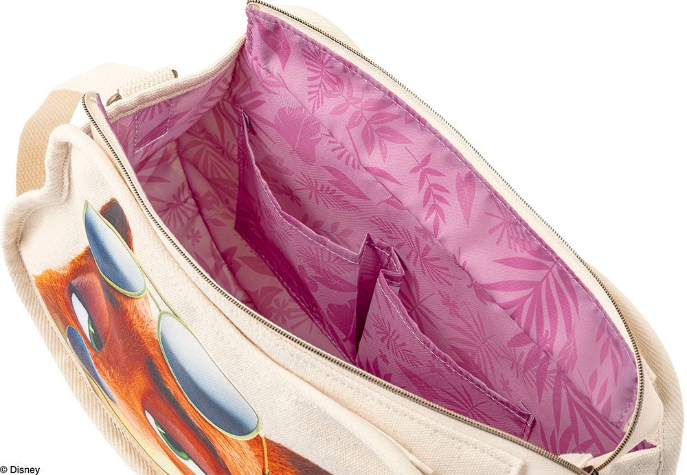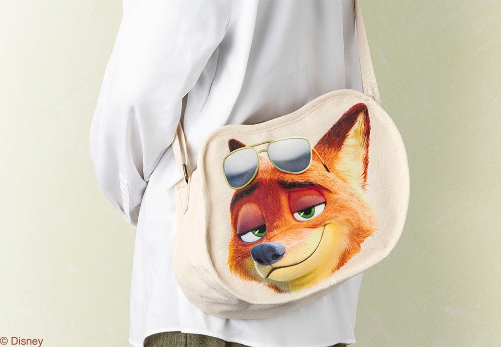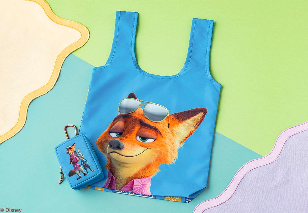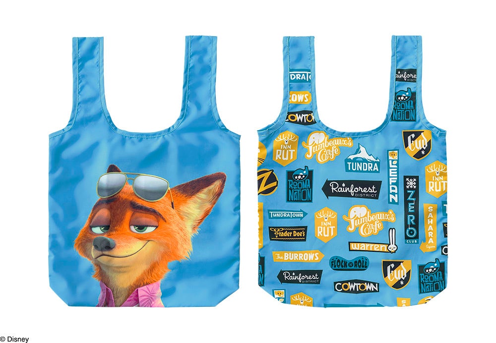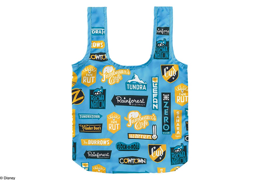 表裏違うデザインが楽しめるエコバッグ。裏面には、「ズートピア」の市街地に並ぶお店の看板をずらっと配置し賑やかに仕上げました。カラビナポーチ付きで、手軽に持ち歩き可能。コンパクトなサイズ感なので、ちょっとだけ買い物をしたり日常使いに便利です。