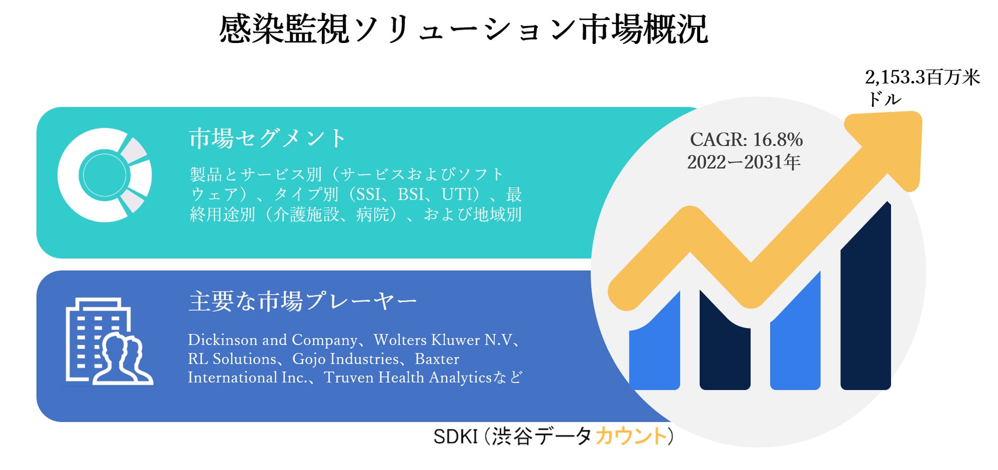 SDKI Inc.は、「感染監視ソリューション市場ー予測2022ー2031年」新レポートを 2022年01月20日に発刊しました。この調査には、感染監視ソリューション市場の成長に必要な統計的および分析的アプローチが含まれています。レポートで提供される主要な産業の洞察は、市場の既存のシナリオに関する読者に市場の概要についてのより良いアイデアを提供します。さらに、レポートには、市場の成長に関連する現在および将来の市場動向に関する詳細な議論が含まれています。