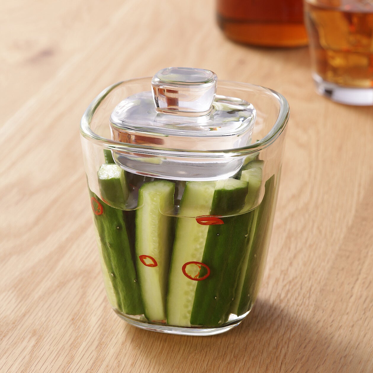 「蓋をしたままレンジで使える 耐熱ガラス容器 小鉢型/中・大」は「ソーダガラス 重石」を組み合わせて、浅漬鉢としても使え、そのまま食卓へ出すこともできます。
