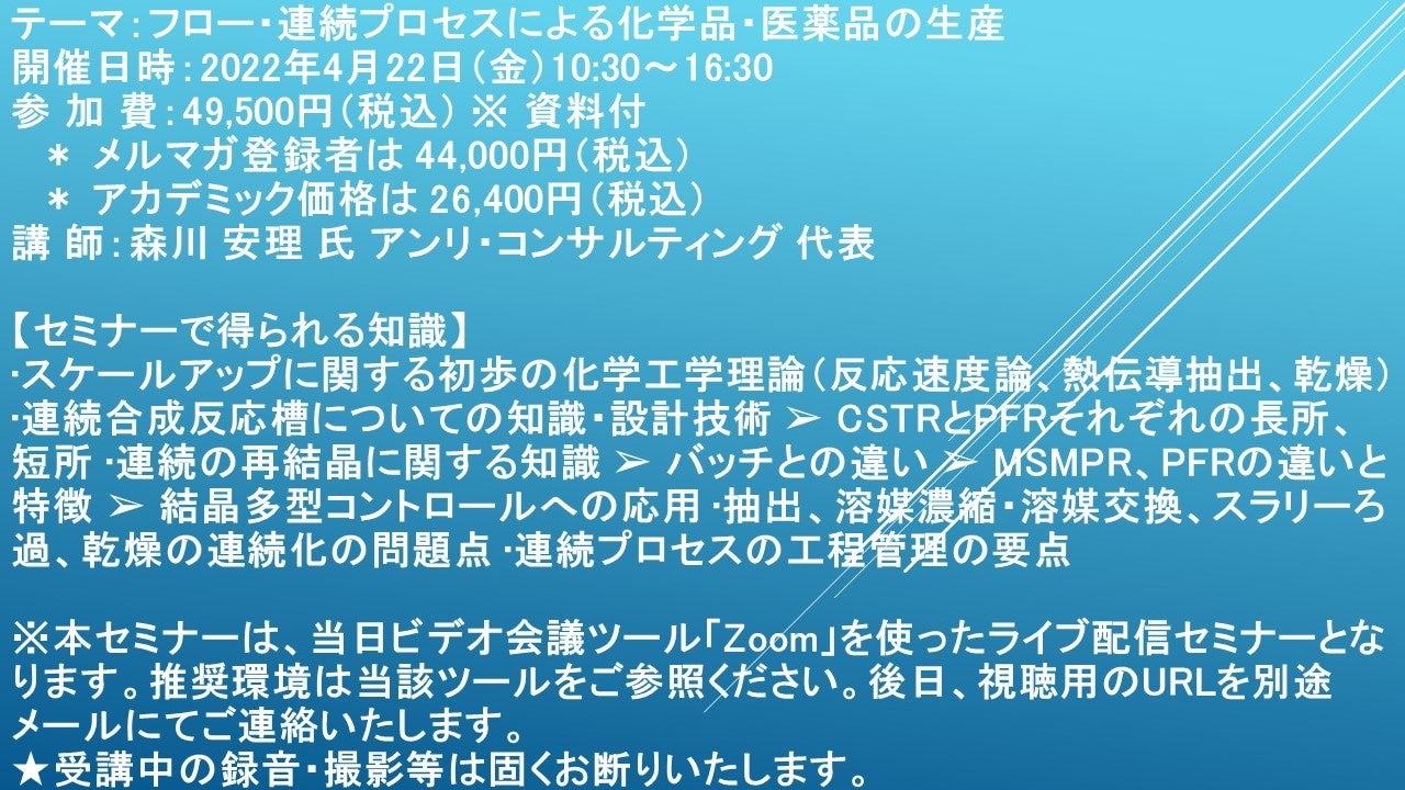 先端技術情報や市場情報を提供している(株)シーエムシー・リサーチ(千代田区神田錦町: https://cmcre.com/ )では、 各種材料・化学品などの市場動向・技術動向のセミナーや書籍発行を行っておりますが、 このたび「フロー・連続プロセスによる化学品・医薬品の生産」と題するセミナーを、 講師に森川 安理 氏 アンリ・コンサルティング 代表)をお迎えし、2022年4月22日(金)10:30より、 ZOOMを利用したライブ配信で開催いたします。 受講料は、 一般:49,500円(税込)、 弊社メルマガ会員:44,000円(税込)、 アカデミック価格は26,400円(税込)となっております(資料付)。