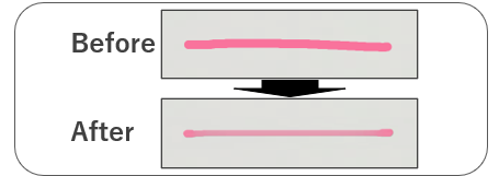 ここで求めているのは実物のペンに似た描き心地です。実際に本物のペンで紙に何度も線を引いて描き心地を確認。その紙をスキャナーでパソコンに取り込んでから拡大して線の細部までチェックし、どうすればプリのペンの描き心地を本物のペンに近づけられるかを検証しました。そこでみつけた方法の一つが、ユーザーがペンを動かした(描いた)速度によるペンの太さと濃淡の変更です。単純な方法ではありますが、その事でペンの描き心地が大きく改善しました。
