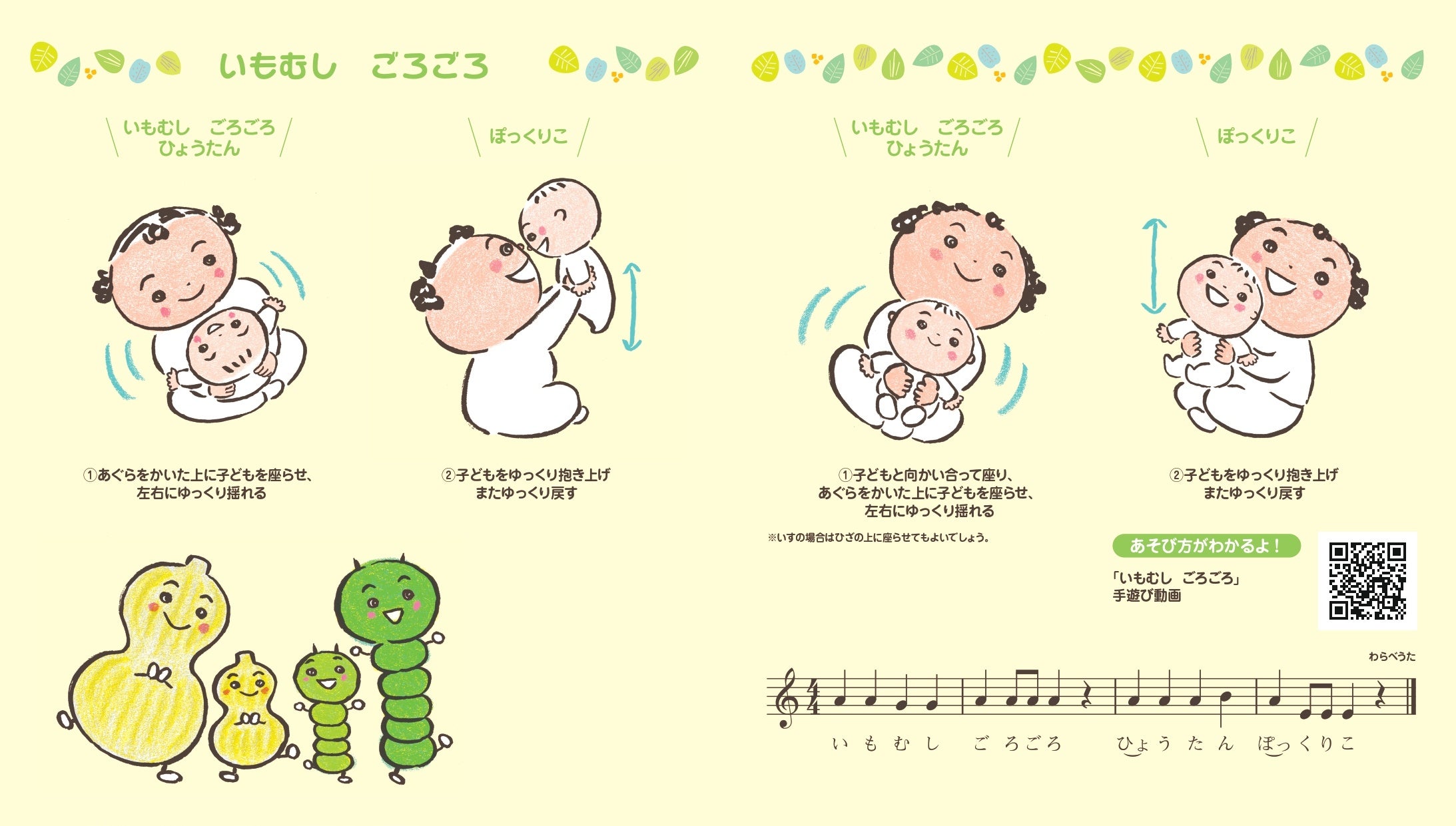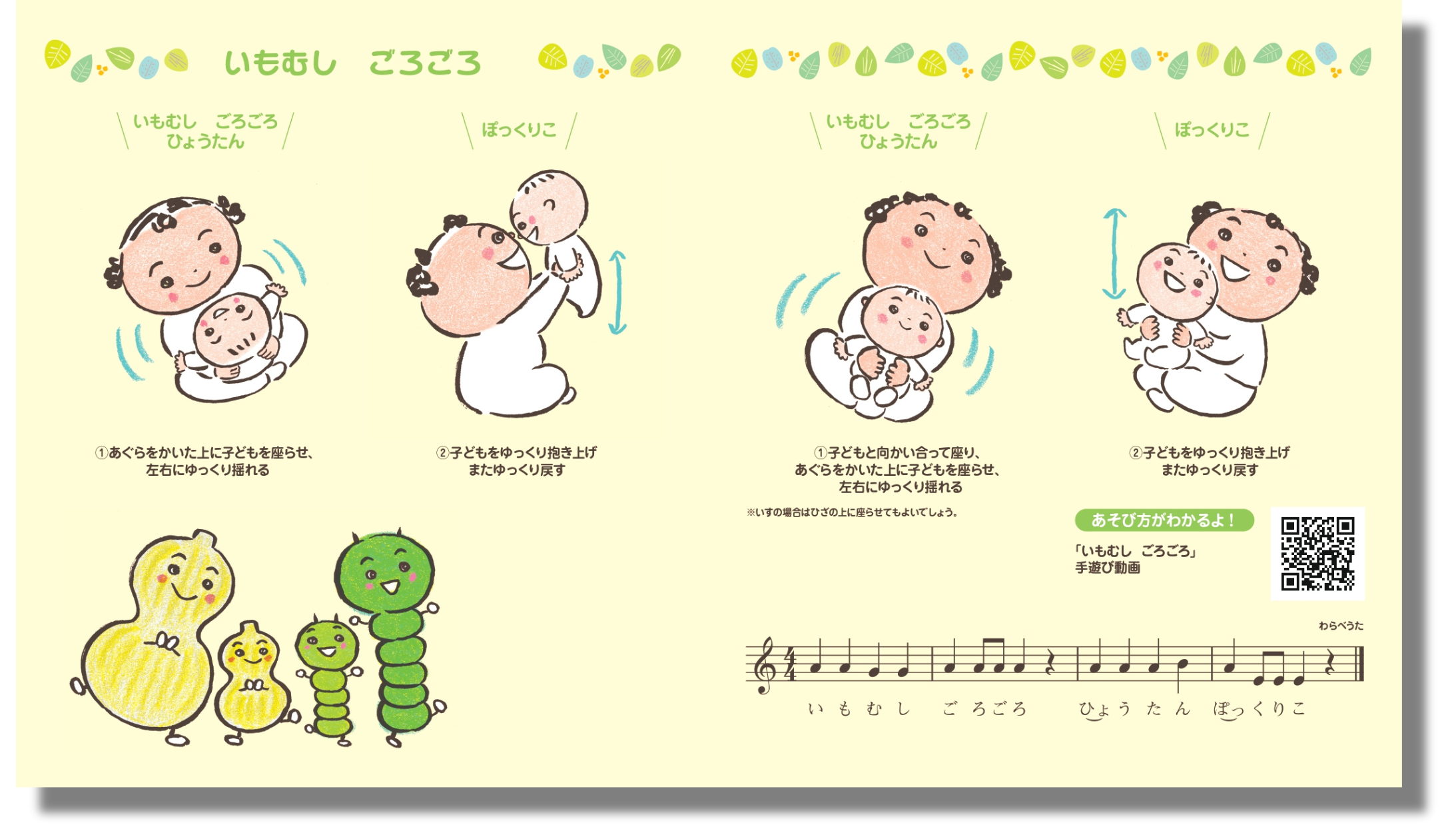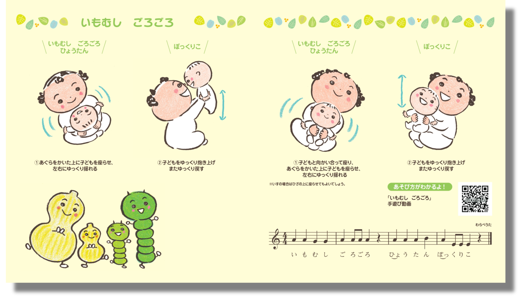 わらべうた「いもむし ごろごろ」で、親子で一緒にゆらゆらたいそうができます。うたったり、体操したり、お話ししたり。何度も楽しめる絵本です。