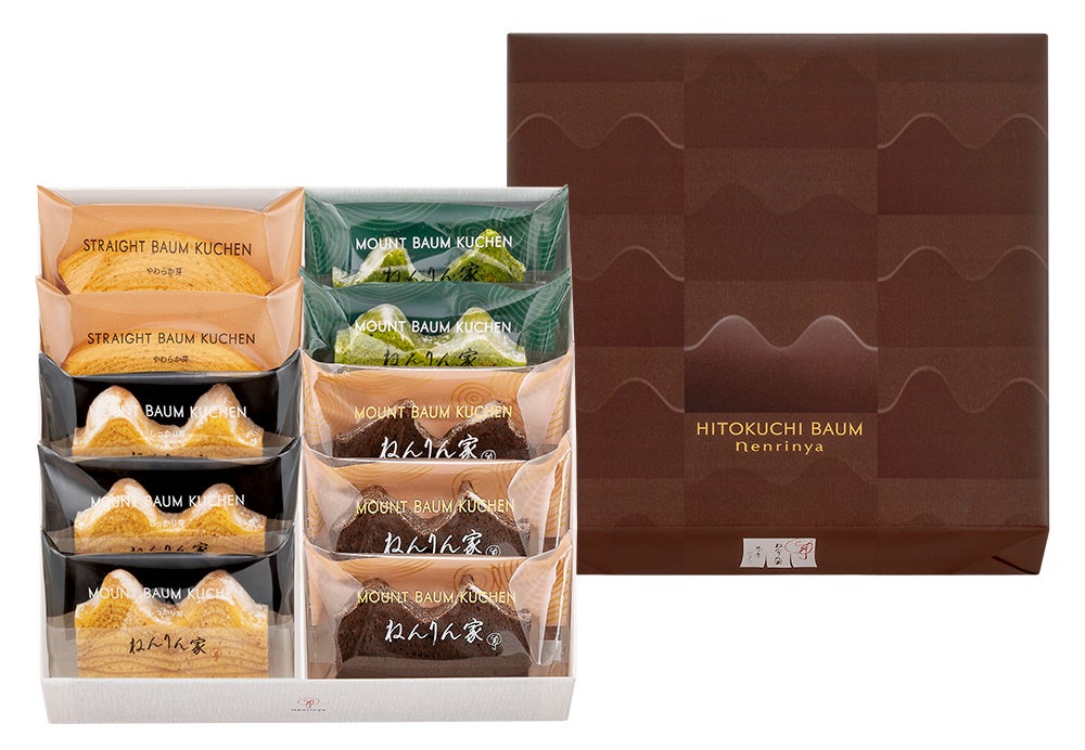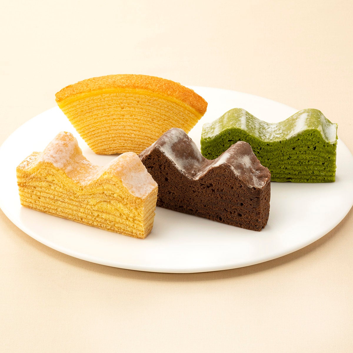 上質な味わいはそのままに、食べやすく上品なひとくちサイズのバームクーヘンです。2つの代表作『マウントバーム しっかり芽』『ストレートバーム やわらか芽』、冬限定『マウントバーム ブラウニー』、芳醇宇治抹茶⾹る『マウントバーム お抹茶』、4種の美味しさが勢ぞろい。