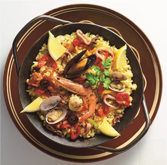 管理栄養士でもある堀知佐子シェフ監修。エビやムール貝、イカなどの魚介を盛り込んだパエリア。