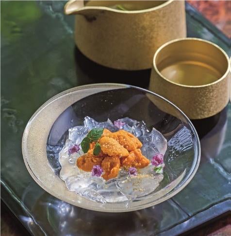 国産バフンウニを干しあげて旨みを濃縮し、昆布出汁のゼリーをまとわせたひやし雲丹。