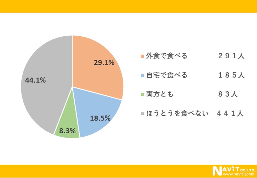 ほうとうを食べる場所は「外食」が最も多くて291人。「自宅」で食べるのは185人。「両方とも」が83人でした。