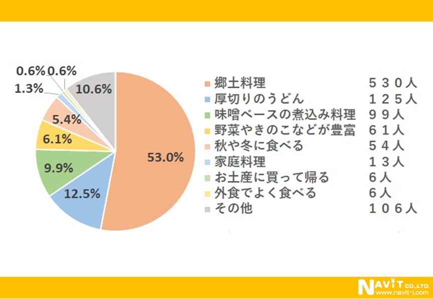 「郷土料理」のイメージがトップで530人。「厚切りのうどん」(125人)、「味噌ベースの煮込み料理」(99人)などがこれに続いています。