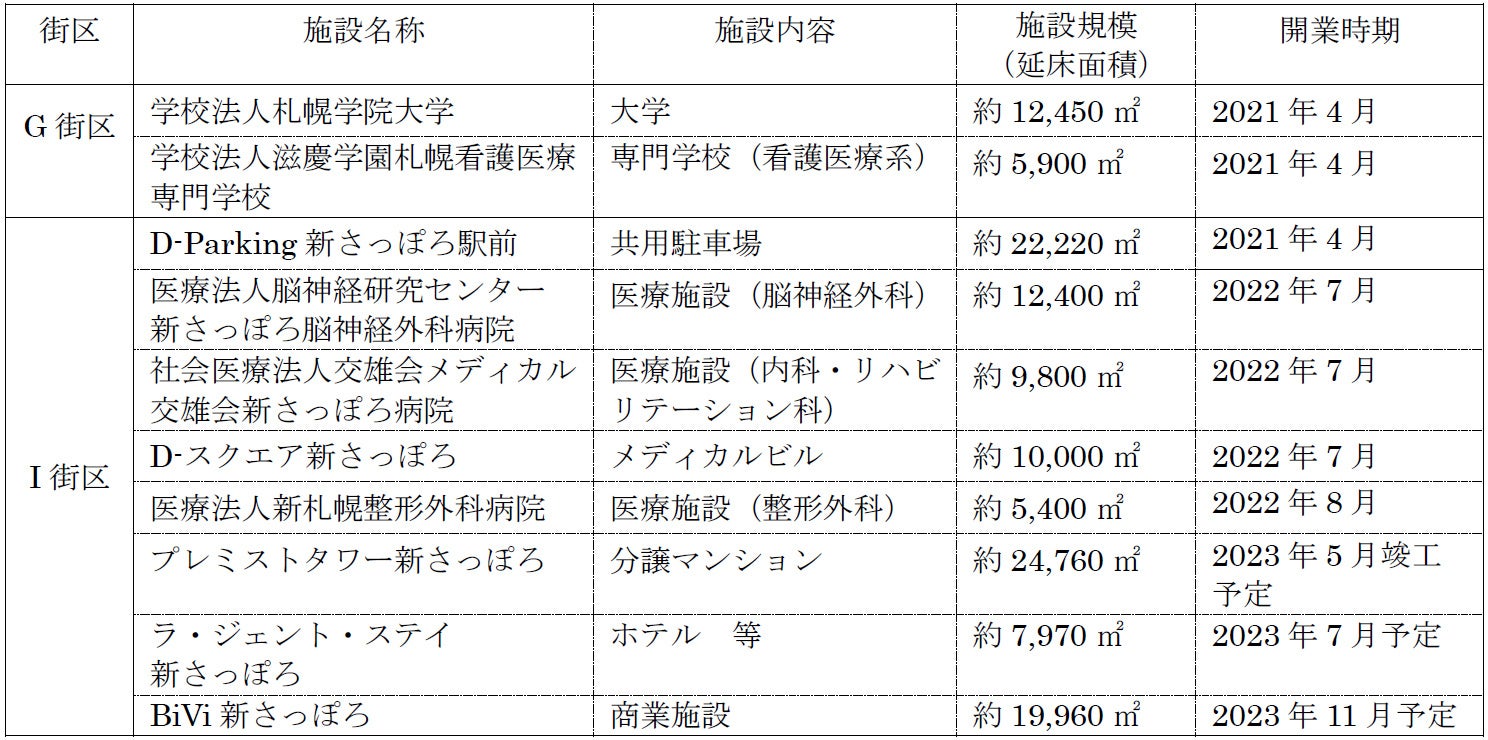I街区では、共用駐車場「D-Parking(ディーパーキング)新さっぽろ駅前」が2021年4月にオープンしたほか、「医療法人脳神経研究センター新さっぽろ脳神経外科病院」「医療法人新札幌整形外科病院」「社会医療法人交雄会メディカル交雄会新さっぽろ病院」「D-スクエア新さっぽろ」の医療施設4棟が2022年7月以降より順次開業するなど、地域住民の健康な生活をサポートしています。