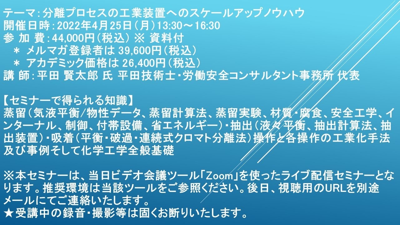 先端技術情報や市場情報を提供している(株)シーエムシー・リサーチ(千代田区神田錦町: https://cmcre.com/ )では、 各種材料・化学品などの市場動向・技術動向のセミナーや書籍発行を行っておりますが、 このたび「分離プロセスの工業装置へのスケールアップノウハウ」と題するセミナーを、 講師に平田 賢太郎 氏 平田技術士・労働安全コンサルタント事務所 代表)をお迎えし、2022年4月25日(月)13:30より、 ZOOMを利用したライブ配信で開催いたします。 受講料は、 一般:44,000円(税込)、 弊社メルマガ会員:39,600円(税込)、 アカデミック価格は26,400円(税込)となっております(資料付)。