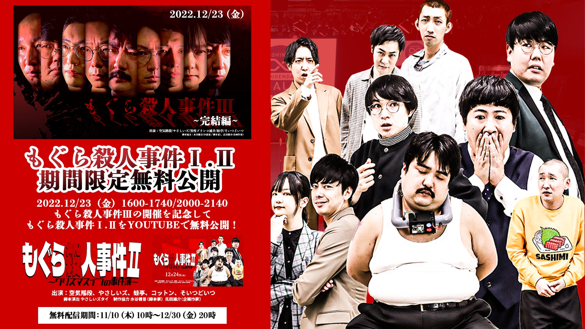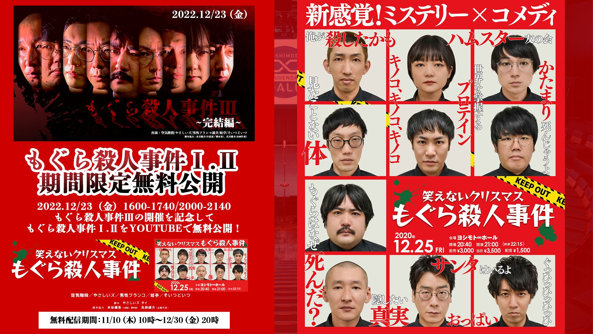 さらに、完結編の開催に先立ち、本作の第一弾『笑えないクリスマス〜もぐら殺人事件〜』と第二弾『もぐら殺人事件Ⅱ~クリスマスイブの事件簿~』をヨシモト∞ホール公式YouTubeチャンネルにて、11月10日(木)10:00~12月30日(金)20:00まで全編無料公開いたします。「もぐら殺人事件Ⅲ~完結編~」の予習として、ぜひお見逃しなく!