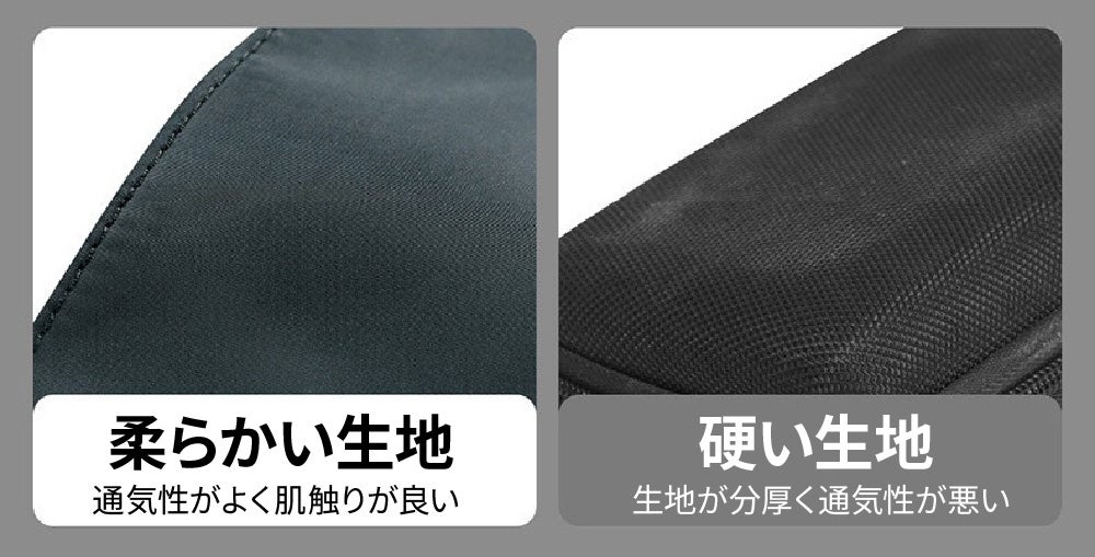 従来の生地は分厚くて通気性が悪いのに比べ、Goxy-Pouchの生地は通気性に優れ、柔らかく肌に優しい素材。