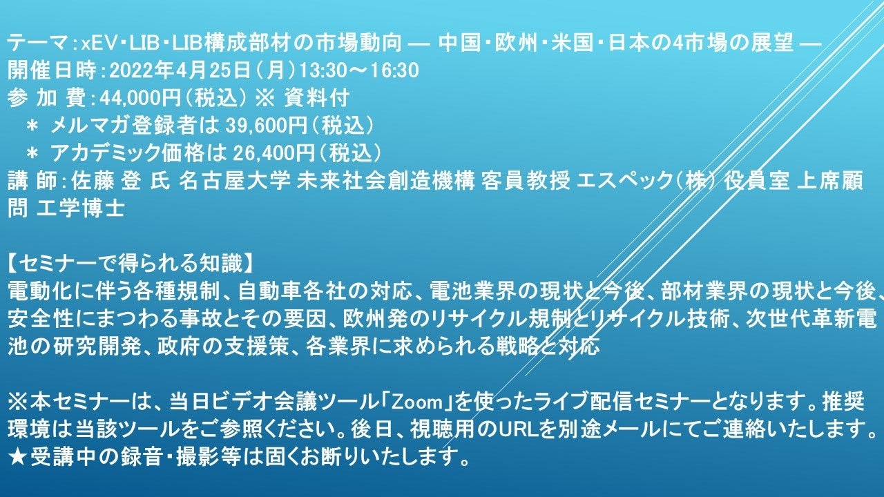 市場動向・技術動向のセミナーや書籍発行を行っておりますが、 このたび「xEV・LIB・LIB構成部材の市場動向 ― 中国・欧州・米国・日本の4市場の展望 ―」と題するセミナーを、 講師に佐藤 登 氏 名古屋大学 未来社会創造機構 客員教授 エスペック(株) 役員室 上席顧問 工学博士)をお迎えし、2022年4月25日(月)13:30より、 ZOOMを利用したライブ配信で開催いたします。 受講料は、 一般:44,000円(税込)、 弊社メルマガ会員:39,600円(税込)、 アカデミック価格は26,400円(税込)となっております(資料付)。