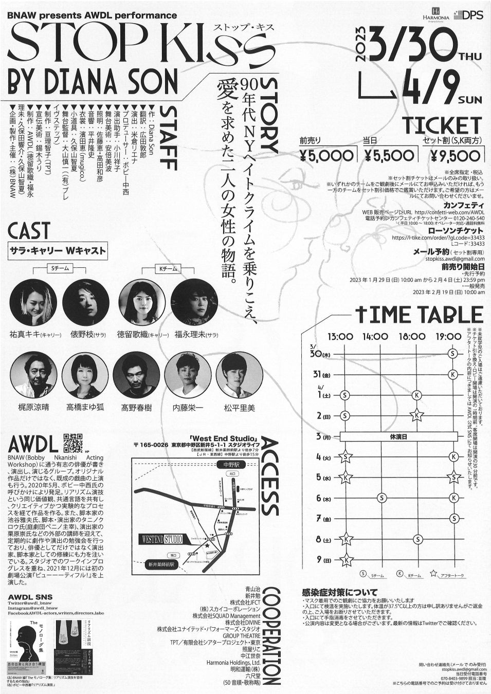 (株)BNAW企画・製作・主催、AWDL『STOP KISS』が2023年3月30日 (木) ~2023年4月9日 (日)にウエストエンドスタジオ(東京都中野区新井5-1-1)にて上演されます。チケットはカンフェティ(運営:ロングランプランニング株式会社、東京都新宿区、代表取締役:榑松 大剛)にて先行発売中です。