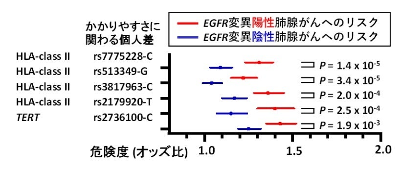これらの遺伝子の個人差は、非喫煙者に発生しやすく、がん細胞の増殖に必要な信号を細胞内に伝える役割を担っているEGFR遺伝子に変異のある肺腺がんのかかりやすさに強くかかわっていました。