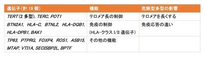表1. 日本人の肺腺がんへのかかりやすさに関わる遺伝子の個人差